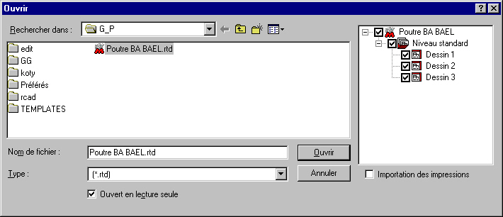 dans la boîte de dialogue Ouvrir affichée sur la figure ci-dessous, sélectionner dans l’arborescence disponible dans la partie droite de la boîte de dialogue le dessin à importer dans le logiciel AutoCAD ® Structural Detailing - Béton Armatures (dans ce cas ce Dessin1, Dessin2, Dessin3 faisant partie de l’affaire Poutre BA BAEL)