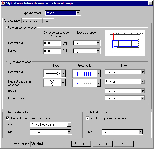 Les paramètres relatifs aux styles d’annotation peuvent être différents pour chaque type d’armature présenté. Pour la répartition des barres, vous pouvez choisir le type d’annotation, le mode de présentation des barres réparties et le style d’annotation. Pour les barres et les profilés acier vous pouvez définir le style d’annotation déterminé dans les préférences du programme.