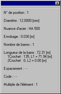 Si vous sélectionnez cette option, le pointeur de la souris prend la forme d’une ‘croix’. Quand le curseur se trouve à proximité de la position (barre, répartition de l’armature), le logiciel affiche une petite boîte de dialogue qui présente les informations sur l’armature sélectionnée. Si l'information sur l'armature n'est pas disponible (par exemple le n° de position ou l'espacement), la boîte de dialogue affiche ‘---‘ au lieu de la valeur. L’exemple des informations sur l’armature est présenté sur la figure ci-dessous.