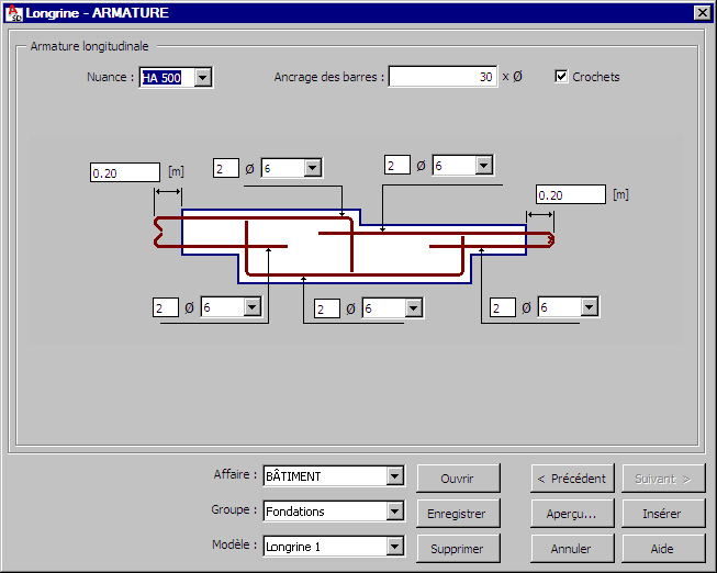 Une fois que vous avez défini les cotes de l'armature de la longrine, cliquez sur Suivant. Le logiciel affiche la boîte de dialogue ci-dessous.