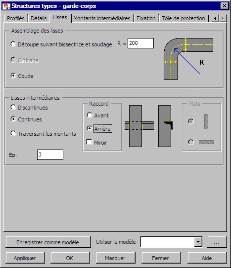 (ce type d'assemblage n'est disponible que pour deux types de mains courantes : simple et verticale) ; les lisses sont continues sur toute la longueur de la polyligne ; dans les lieux d'assemblage des lisses, les segments sont cintrés ; pour ce type d'assemblage des lisses, il faut définir le rayon de cintrage R.
