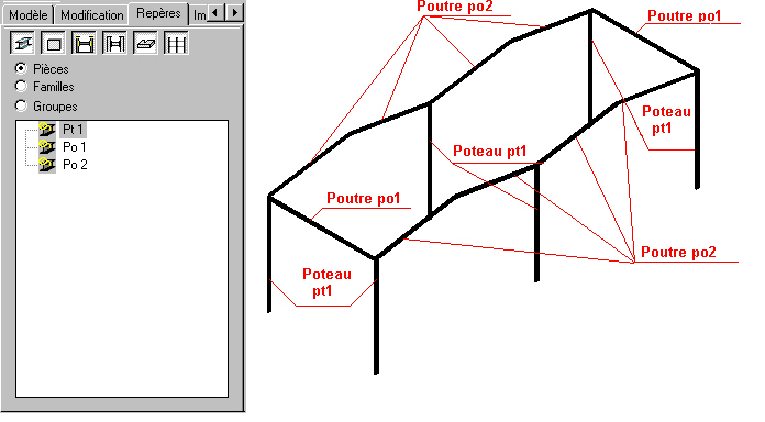 le logiciel affectera des repères à tous les éléments du portique 3D, en fonction des paramètres définis dans la boîte de dialogue Repérage automatique. Etant donné que certains éléments du portique sont identiques, trois repères seront créés sur l’onglet Repères de la boîte de dialogue Gestionnaire d’objets : poteaux pot1, poutres pou1 et poutres pou2. La figure ci-dessous présente les repères créés et l’emplacement des éléments de la structure appartenant aux repères spécifiques.