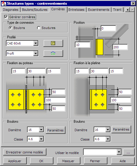 Si l’option Générer cornières est cochée, les cornières d’assemblage seront générées. L’activation de l’option Générer cornières permet de créer les cornières assemblant la platine au poteau.