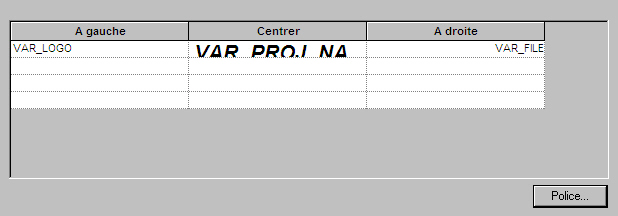Afin de modifier les paramètres de l’en-tête, cliquez sur le champ du tableau présentant les paramètres de l’en-tête ; vous disposez de la liste des variables dans laquelle vous pouvez sélectionner la variable voulue. Si le curseur est situé sur le champ du tableau avec les paramètres de l’en-tête, un clic sur le bouton Police ouvre la boîte de dialogue dans laquelle vous pouvez choisir la police pour le champ sélectionné.