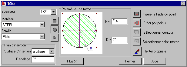 La boîte de dialogue est ouverte avec les paramètres de la tôle précédemment définie.