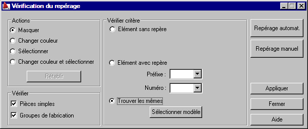 Dans la zone Vérifier, vous pouvez sélectionner les éléments (pièces simples ou groupes de fabrication) qui seront prises en compte lors de la vérification des repères.