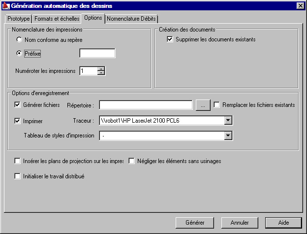 Dans l'onglet Options de la boîte de dialogue Génération automatique des dessins, vous disposez de plusieurs paramètres, notamment la nomenclature des impressions et les options d'enregistrement.