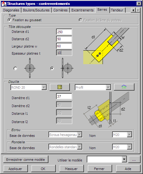 Les onglets Barres et Tendeur sont disponibles dans la boîte de dialogue Contreventements, si sur l’onglet Diagonales, le profilé plein (p.ex. ROND 20) a été choisi. Les options disponibles sur cet onglet permettent de définir les paramètres des de l’assemblage des barres et les paramètres de la génération du tendeur.