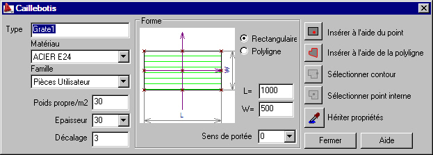 La boîte de dialogue Caillebotis est divisée en trois parties :