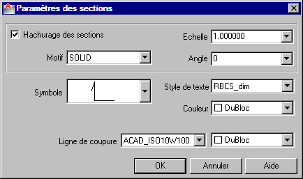 La boîte de dialogue ci-dessous est ouverte après un clic sur le bouton Paramètres des sections disponible dans la boîte de dialogue de définition/modification du style de cote.