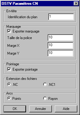 Utilisez la boîte de dialogue DSTV Paramètres CN afin de définir d'autres paramètres de pointage et de marquage. Cette boîte de dialogue s'ouvre lorsque vous cliquez sur Paramètres dans la boîte de dialogue Import/Export DSTV.