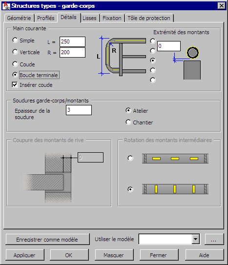 Les options disponibles sur cet onglet permettent de définir les détails des garde-corps et des montants.