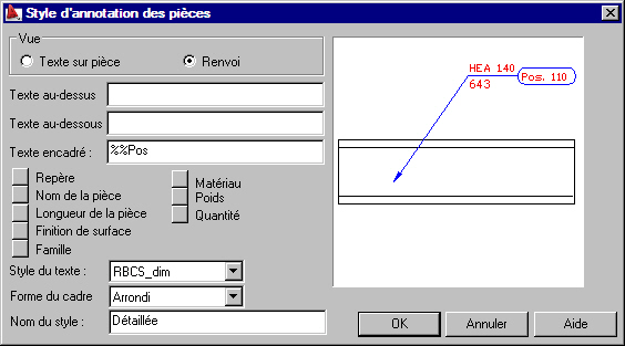 La boîte de dialogue est ouverte après un clic sur le bouton Nouveau ou Modifier dans la boîte de dialogue Styles d’annotations, si la catégorie Pièces ou Groupes de fabrication a été sélectionnée.