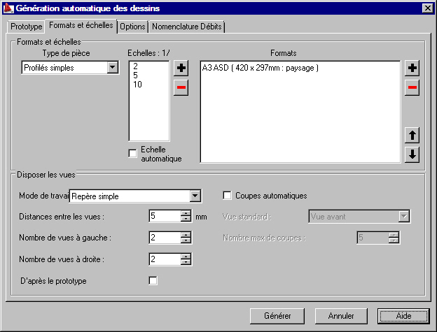 Dans l'onglet Formats et échelles de la boîte de dialogue Génération automatique des dessins, vous pouvez définir les échelles, les formats et les vues pour une option (objet) sélectionnée dans le champ Type de pièce.