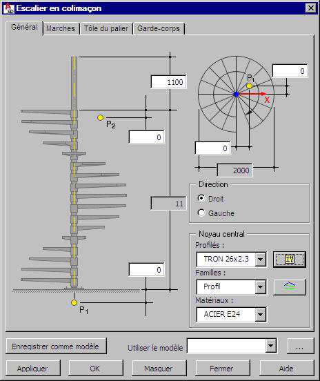 - Menu : Acier > Structures paramétrées > Escalier en colimaçon