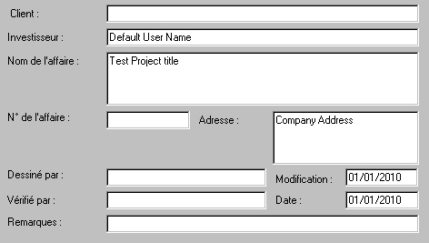 Dans les champs d’édition, vous pouvez entrer les informations générales relatives à l'affaire. Ces champs correspondent aux variables utilisées dans les cellules des tableaux inclus dans les dessins et dans les en-têtes des impressions :