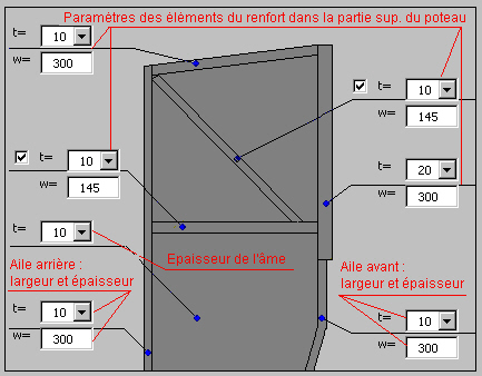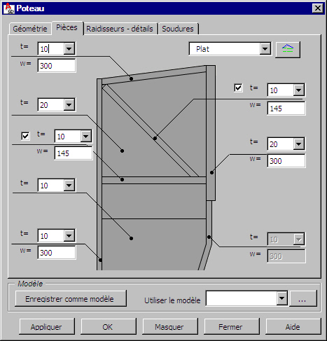 Après la définition des cotes de la poutre à âme pleine, cliquez sur l’onglet Pièces pour définir les paramètres et les cotes des tôles et raidisseurs.