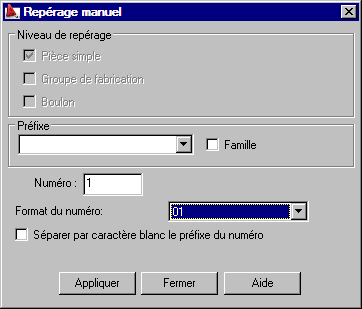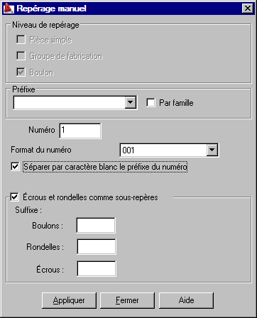 Elle inclut l'option Ecrous et rondelles comme sous-repères. Les détails concernant cette option se trouve dans la description de numérotation pour le repérage automatique.