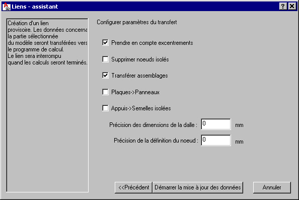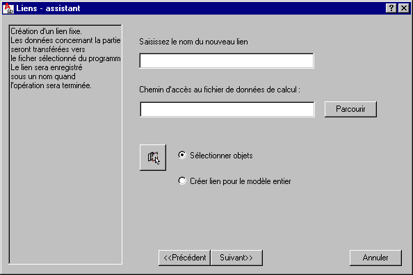 La mise à jour du fichier de CAO et du fichier contenant le modèle de calcul de la structure s'effectue dans la boîte de dialogue de l'assistant Liens ci-dessous. Pour ouvrir cette boîte de dialogue :