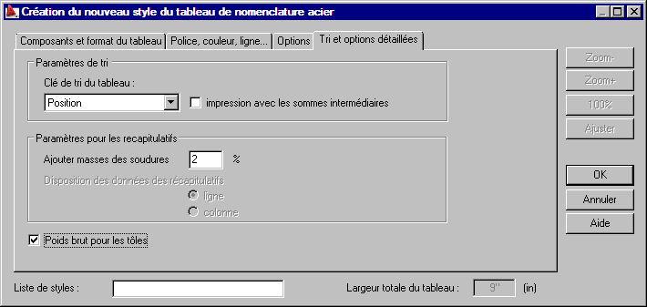 Après la sélection de l'onglet Tri et options détaillées dans la boîte de dialogue Création du nouveau style/Modification du style du tableau de nomenclature acier, la boîte de dialogue prend l'aspect présenté sur la figure ci-dessous :