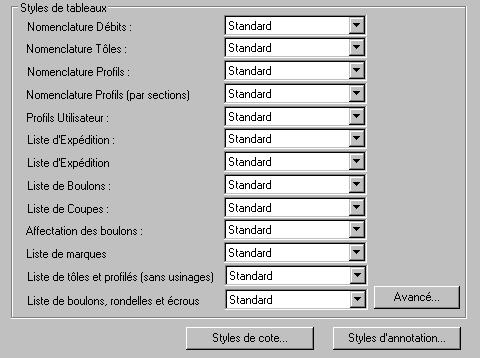 Cliquez sur le bouton Avancé... pour ouvrir la boîte de dialogue Tableaux nomenclatures acier - gestionnaire de styles.