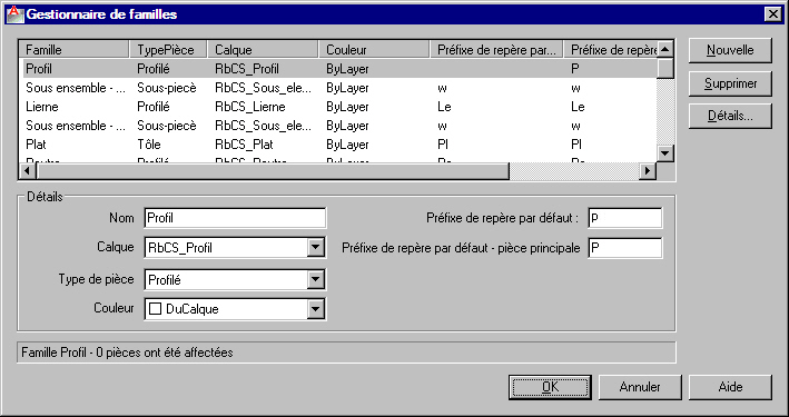 - Couleur - couleur qui sera affectée aux pièces appartenant à la famille définie.