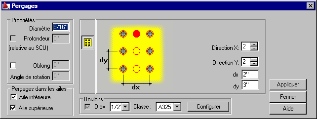 Utilisez le bouton Appliquer pour modifier simultanément les paramètres de boulons et de perçage, ainsi que l'espacement dans les résultats d'aperçu de la modification.