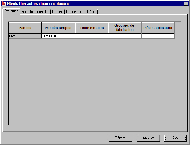 Dans la boîte de dialogue Génération automatique des dessins, l'onglet Modèles, vous pouvez définir le type d'une pièce et la famille à laquelle elle appartient.