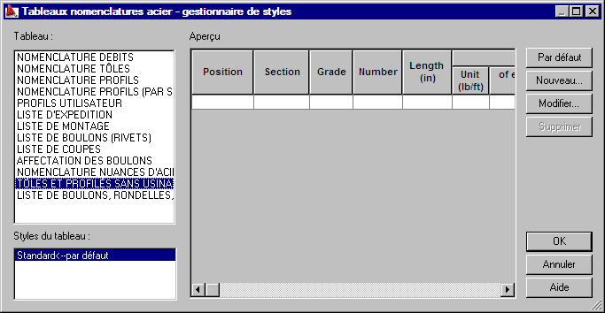 Les types de tableaux nomenclatures disponibles dans le logiciel sont (présentés dans la zone Tableau de la boîte de dialogue ci-dessus) :