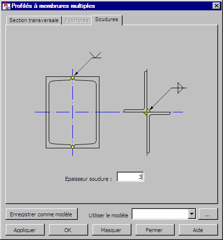 Dans la partie inférieure de la boîte de dialogue, le champ de sélection Utiliser modèle est disponible. Ce champ contient les modèles (schémas) des profilés à membrures multiples définis par l’utilisateur. Après avoir défini la géométrie et les paramètres du profilé à membrures multiples, vous pouvez enregistrer le tout en saisissant le nom dans le champ Utiliser modèle et ensuite, en cliquant sur le bouton Enregistrer. Au moment voulu, quand vous commencez la définition du profilé, vous pouvez choisir le nom du modèle enregistré et les paramètres seront configurés de la même façon que dans le modèle enregistré.