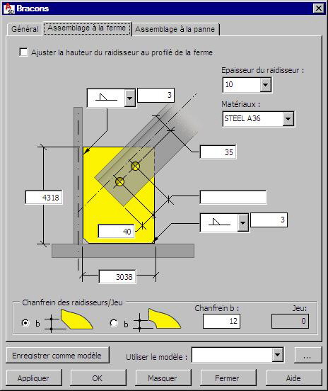 L’assemblage du bracon à la ferme est un raidisseur soudé à la ferme (sur toute la longueur de la ferme ou sur une partie), à laquelle ensuite le bracon est fixé. Pour définir cet assemblage, il faut entrer :