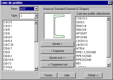 Dans cette boîte de dialogue, vous pouvez ajouter à la liste des profilés dans le logiciel Autodesk AutoCAD Structural Detailing - Steel, les profilés à partir des bases disponibles dans le logiciel. Afin d’ajouter le profilé à la liste des profilés disponibles, il faut :