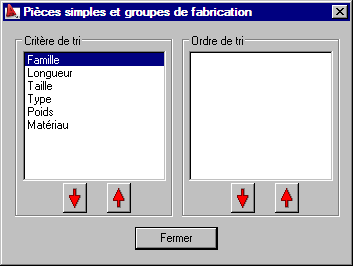 Les pièces simples et les groupes de fabrication peuvent être triées par :