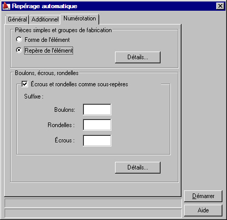 Cliquez sur Détails dans la partie inférieure de l'onglet Numérotation afin d'ouvrir la boîte de dialogue Boulons, écrous, rondelles, laquelle comporte deux onglets :