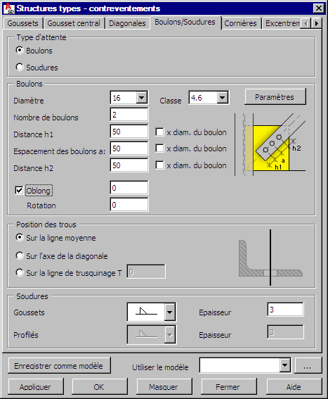 diamètre et classe du boulon ; cliquez sur le bouton Paramètres pour ouvrir la boîte de dialogue Paramètres des boulons