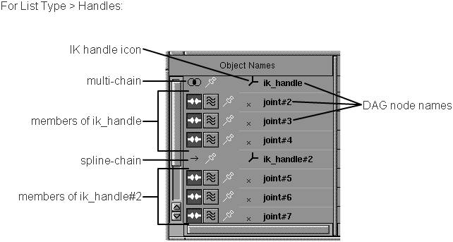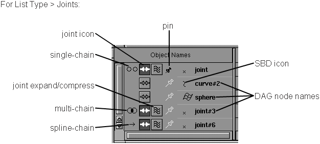 Le contenu de la liste dépend de la sélection effectuée dans la liste. Chaque élément de la liste contient jusqu'à quatre icônes, plus un DAG icône du noeud et DAG nom du noeud.