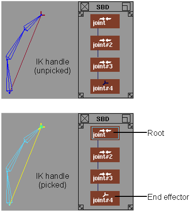 - Ajouter un identificateur de CI en choisissant deux liaisons (la racine en premier, puis l'effecteur final) à l'aide de l'option Animation > CI > Ajouter CI poignée