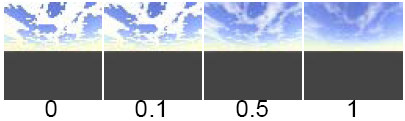 Les nuages sont mises à l'échelle et placé en ajustant la puissance. La densité du nuage est obtenue en soustrayant le seuil à partir de la valeur de pixel la délimitation à 0, puis en multipliant le résultat par Densité. Pour contrôler la quantité de unfocusing du Cloud_texture, ajustez le Flou(sous Paramètres du soleil). La plage des valeurs autorisées est de 0 à l'infini. La plage de la glissière est 0 à 1. La valeur par défaut est 1.