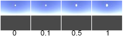 La taille (rayon) de halo autour du soleil. La plage des valeurs autorisées va de 0 à 1000. La plage de la glissière est 0 à 20. La valeur par défaut est 1.
