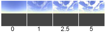 La densité des nuages. La plage des valeurs autorisées est de 0 à l'infini. La plage de la glissière est 0 (aucun nuage) et 5 (Heavy nuage). La valeur par défaut est 1.
