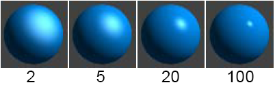 Contrôle la taille des reflets brillants sur la surface. Ce paramètre est uniquement disponible lorsque l'option Modèle d'ombrage est Phong. La plage des valeurs autorisées est de 2 à l'infini. La plage du curseur est 2 (large, pas très surface brillante) à 100 (faible reflet très brillant surface). La valeur par défaut est de 20.