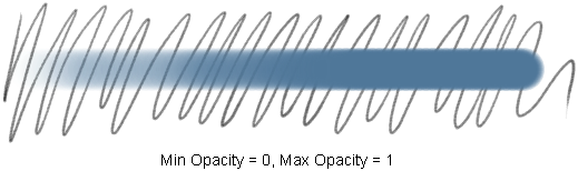 Vous pouvez effectuer la modification de l'opacité du pinceau en fonction de la pression appliquée au stylet sur la tablette. L'opacité min est la valeur minimale de l'opacité du pinceau (lorsque vous appuyez légèrement avec le stylet) et l'opacité Max est la valeur maximale de l'opacité du pinceau (lorsque vous appuyez fort avec le stylet). Si vous ne souhaitez pas que l'opacité à varier en fonction de la pression du stylet sur la tablette, définissez l'opacité Min et Max Opacité sur la même valeur.