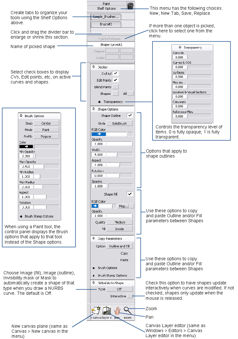 Le tampon de pinceau options vous permettent de capturer un instantané d'une image à utiliser comme un pinceau. Vous pouvez entrer simplement la forme ou la forme et sa texture (couleur). La liste déroulante Capture prend le cliché et immédiatement est désactivée. Le menu déroulant contrôle alors le pinceau. Le menu contextuel vous permet de choisir si vous souhaitez peindre uniquement avec la forme ou la forme et la texture.