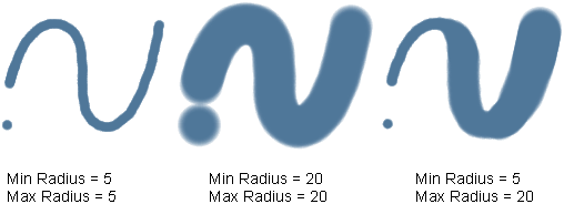 La taille du pinceau est basé sur son rayon min (lorsque vous appuyez légèrement avec le stylet) et son rayon Max (lorsque vous appuyez fort avec le stylet). Si vous ne souhaitez pas que la taille à varier en fonction de la pression du stylet sur la tablette, définissez le rayon min et max rayon sur la même valeur. Petit pinceau sont plus réactif que gros pinceaux.