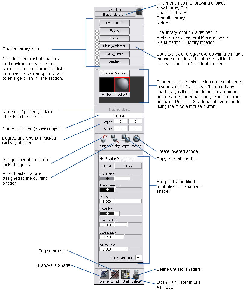 Les ombrages dans Resident Shaders sont spécifiques au fichier ouvert, de sorte qu'elles changent de fichier à un fichier. La valeur initiale par défaut sont le noir et un ombrage d'environnement DefaultShader grise. Cliquez deux fois sur n'importe quel ombrage dans l'étagère active pour l'ajouter à l'ombrage habitant de l'étagère.
