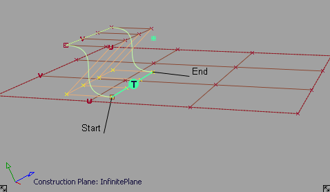 La tangence et la courbure de l'axe est défini par le plan tangent de la surface au point de contact, et la direction du vecteur spécifié par Options de vecteur. La tangence et la courbure des CV sur la courbe ne sont pas autorisés à se déplacer dans la direction du vecteur. Cela revient à créer un curve-on-surface sur la surface et aligner la courbe libre.
