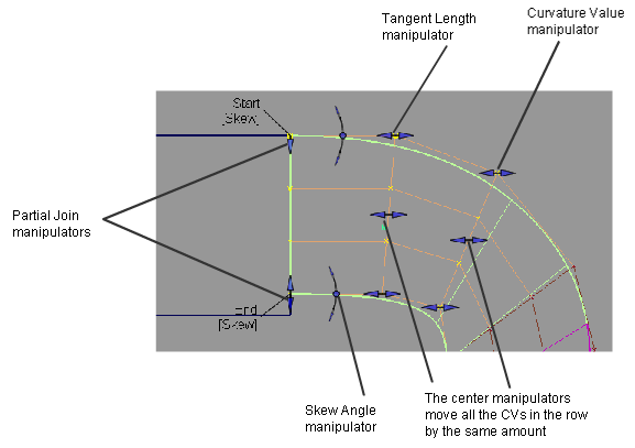 La jointure des manipulateurs sont toujours affichés. Utilisez les manipulateurs (ou la Partials curseurs) pour contrôler l'étendue. Partielle applique lorsqu'une arête de surface est alignée à une autre arête de surface, Isoparm, curve-on-surface ou courbe libre