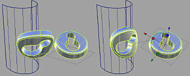 À l'aide du manipulateur, vous pouvez déplacer le point de contact par rapport aux cibles dans leur position d'origine. Dès que vous changez la position du point de contact conformées cibles, la mise à jour pour afficher les effets de la modification. Vous pouvez également utiliser le manipulateur pour accrocher le point de contact à un point spécifique de la cible d'origine : cliquez sur le point bleu clair au centre du manipulateur. Une fois celui-ci devient blanche, vous pouvez utiliser la normale curve-snapping techniques pour accrocher le point de contact sur n'importe quelle partie de l'original cibles, comme indiqué ci-après :