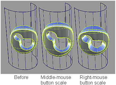 Utilisez l ' échelle pour régler la taille de la cible par rapport à la cible, à l'aide du point de contact que le pivot de l'échelle. Si la cible est mis à l'échelle afin de s'étendre au-delà de la cible, l'outil extrapole de façon tangentielle. Utilisez le bouton gauche de la souris pour mettre à l'échelle (cliquez et faites glisser le curseur vers la gauche ou vers la droite) les cibles de manière proportionnelle. Utilisez le bouton central de la souris pour mettre à l'échelle le long de la surface de destination (la cible de plus en plus grande, mais pas plus épaisses) ; utilisez le bouton droit de la souris pour modifier l'échelle de l'épaisseur de la cible devient.