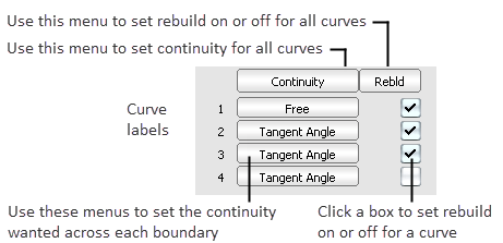 Crée des surfaces par fusion quatre courbes limite (ou de segments de courbe), tout en conservant la continuité avec les surfaces adjacentes.